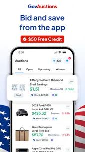 GOVAUCTIONS.COM IS A PRIVATE COMPANY AND IS NOT THE GOVERNMENT, OR AFFILIATED WITH IT. Auctions LLC is a private company on a mission to make surplus auctions more accessible for everyone.GovAuctions.com is the app for surplus auctions, featuring authentic government surplus alongside curated retail surplus deals. Bid on brand-new products at a fraction of retail value.Easily explore and bid on thousands of daily auctions on GovAuctions. We're not a Government agency, we're an app that makes bidding and saving on surplus accessible for everyone.Why you’ll love the app:• Safe and secure access to bidding• Thousands of daily auctions, 15+ types• Auctions start at $0 with no reserves• Free and fast US shippingAnd everything else you'll love:• Free and fast USA shipping• Friendly 24/7 customer support• SSL-secured paymentsDownload and start bidding today. Terms of Use and Privacy Policy apply. GovAuctions.com is NOT a Government agency, nor affiliated in any way with the United States government or any other state, local, international or foreign government. Auctions LLC is a private company on a mission to make surplus auctions more accessible for everyone.¹ '$50 Free Credit' only valid as a discount on first purchase of optional credit pack for bidding, eg reducing an $80 pack to just $30. Offer valid while displayed on the app store page.² As advertised on respective news site. Logos are property of their respective owners.³ Illustrated 'Sold' prices represent final auction costs paid by winners, on GovAuctions or affiliated sites. Price includes full final sales price and any credit costs.